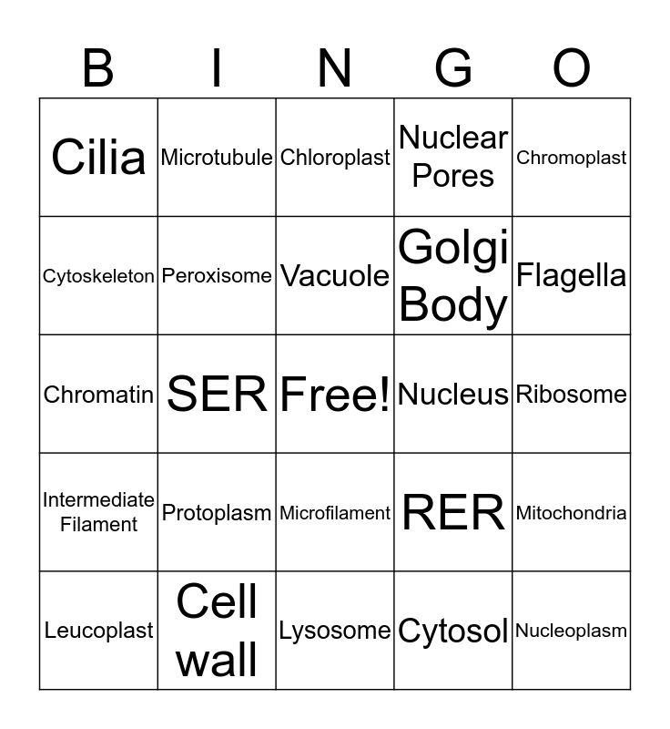 This bingo card has a free space and 24 words: Protoplasm, Cell wall, Vacuole, Leucoplast, Chromoplast, Cilia, Cytoskeleton, Microtubule, Nucleus, Microfilament, Golgi Body, Chromatin, RER, Mitochondria, Peroxisome, Cytosol, Ribosome, Chloroplast, Flagella, SER, Nucleoplasm, Intermediate Filament, Nuclear Pores and Lysosome.