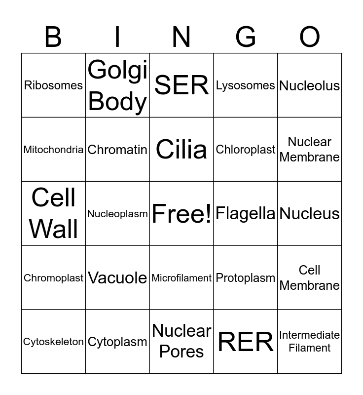 This bingo card has a free space and 24 words: Vacuole, Cytoplasm, Cilia, Cytoskeleton, Nucleolus, Ribosomes, Mitochondria, Golgi Body, Flagella, Microfilament, Chloroplast, Cell Wall, Protoplasm, Cell Membrane, Chromatin, RER, Nucleus, SER, Nuclear Membrane, Nucleoplasm, Intermediate Filament, Chromoplast, Lysosomes and Nuclear Pores.