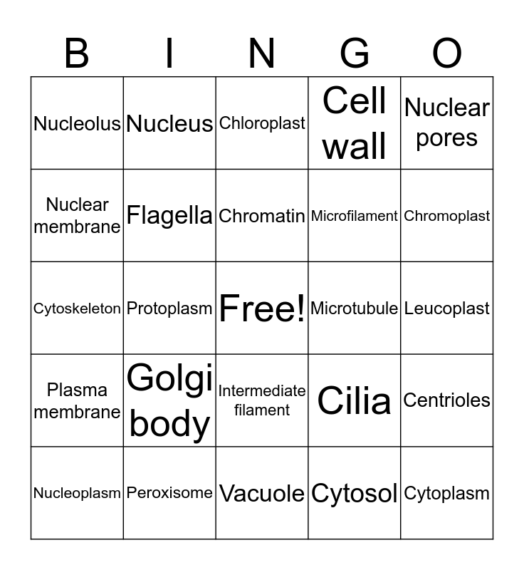 This bingo card has a free space and 24 words: Golgi body, Peroxisome, Chromatin, Nucleoplasm, Nuclear pores, Nucleolus, Nuclear membrane, Nucleus, Microtubule, Intermediate filament, Microfilament, Cytoskeleton, Cilia, Centrioles, Flagella, Cytosol, Leucoplast, Chloroplast, Chromoplast, Protoplasm, Cytoplasm, Plasma membrane, Cell wall and Vacuole.
