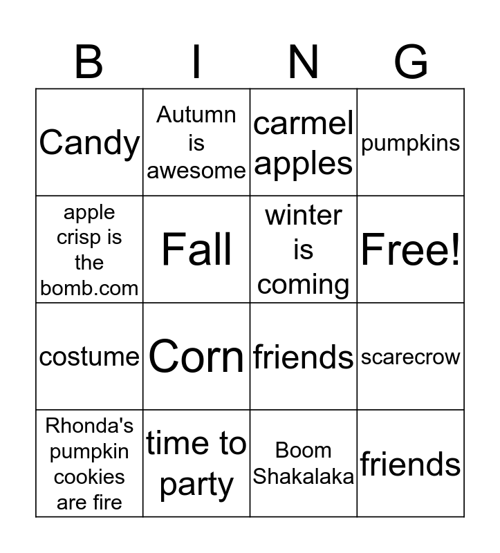 This bingo card has 17 words: Boom Shakalaka, Rhonda's pumpkin cookies are fire, carmel apples, Candy, Corn, pumpkins, scarecrow, winter is coming, Free!, Fall, time to party, friends, apple crisp is the bomb.com, Autumn is awesome, costume, flannels and friends.