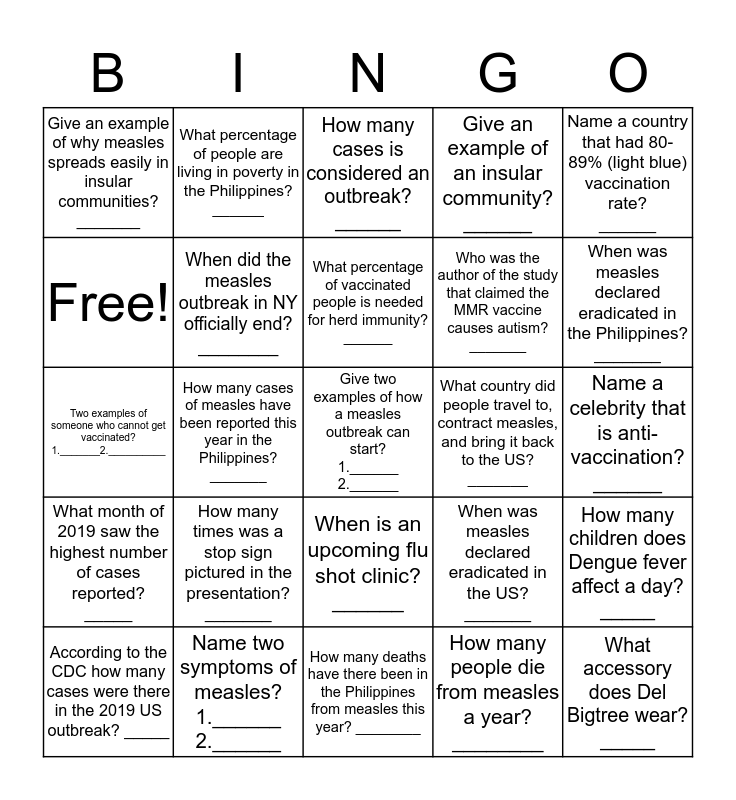 This bingo card has a free space and 26 words: When is an upcoming flu shot clinic? ______, How many people die from measles a year? ________, What percentage of vaccinated people is needed for herd immunity? ______, Name two symptoms of measles? 1.______ 2.______, Name a country that had 80-89% (light blue) vaccination rate? ______, Give an example of why measles spreads easily in insular communities? _______, Free!, What percentage of people are living in poverty in the Philippines? ______, Name a celebrity that is anti-vaccination? ______, When was measles declared eradicated in the US? _______, Who was the author of the study that claimed the MMR vaccine causes autism? _______, Two examples of someone who cannot get vaccinated? 1._______2.__________, How many children does Dengue fever affect a day? _____, According to the CDC how many cases were there in the 2019 US outbreak? _____, How many cases of measles have been reported this year in the Philippines? _______, How many states had confirmed cases of measles in the 2015 outbreak? ______, Give an example of an insular community? ______, What month of 2019 saw the highest number of cases reported? _____, How many cases is considered an outbreak? ______, What accessory does Del Bigtree wear? _____, When was measles declared eradicated in the Philippines? _______, How many deaths have there been in the Philippines from measles this year? ________, What country did people travel to, contract measles, and bring it back to the US? _______, How many times was a stop sign pictured in the presentation? _______, When did the measles outbreak in NY officially end? ________ and How much were people fined in NY for not being vaccinated? _______.
