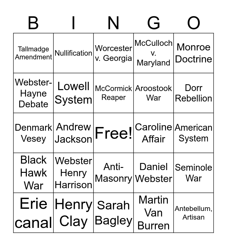 This bingo card has a free space and 69 words: Adams-Onis Treaty, American System, Francis Cabot Lowell, Gibbons v. Ogden, Henry Clay, John Quincy Adams, McCulloch v. Maryland, Missouri Compromise, Monroe Doctrine, Panic of 1819, Seminole War, Stephen H. Long, Tallmadge Amendment, Worcester v. Georgia, Alexis de Tocqueville, Andrew Jackson, Anti-Masonry, Aroostook War, Bank War, Black Hawk War, Caroline Affair, Daniel Webster, Dorr Rebellion, Five Civilized Tribes, Indian Removal Act, Indian Territory, John C. Calhoun, John Tyler, Martin Van Burren, Nicholas Biddle, Nullification, Panic of 1837, Roger B. Taney, Seminole Wars, Specie Circular, Spoils System, Trail of Tears, Webster-Ashburton Treaty, Webster-Hayne Debate, Whigs, Webster Henry Harrison, Antebellum, Artisan, Baltimore and Ohio Railroad, Commonwealth v. Hunt, Cult of Domesticity, Erie canal, Factory Girls Association, Factory System, Know-Nothings, Lowell System, McCormick Reaper, Morse Code, Nativism, Sarah Bagley, Western Union Telegraph Company, Abolitionist, Amistad, Cotton Kingdom, Cult of Honor, Denmark Vesey, Elizabeth Keckley, Gabriel Prosser, James Henry Hammond, Manumissions, Nat Turner, Peculiar Institution, Planter Class, Second Middle Passage and Slave Codes.