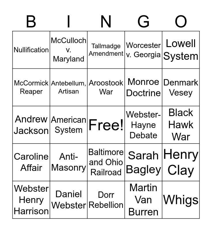 This bingo card has a free space and 69 words: Adams-Onis Treaty, American System, Francis Cabot Lowell, Gibbons v. Ogden, Henry Clay, John Quincy Adams, McCulloch v. Maryland, Missouri Compromise, Monroe Doctrine, Panic of 1819, Seminole War, Stephen H. Long, Tallmadge Amendment, Worcester v. Georgia, Alexis de Tocqueville, Andrew Jackson, Anti-Masonry, Aroostook War, Bank War, Black Hawk War, Caroline Affair, Daniel Webster, Dorr Rebellion, Five Civilized Tribes, Indian Removal Act, Indian Territory, John C. Calhoun, John Tyler, Martin Van Burren, Nicholas Biddle, Nullification, Panic of 1837, Roger B. Taney, Seminole Wars, Specie Circular, Spoils System, Trail of Tears, Webster-Ashburton Treaty, Webster-Hayne Debate, Whigs, Webster Henry Harrison, Antebellum, Artisan, Baltimore and Ohio Railroad, Commonwealth v. Hunt, Cult of Domesticity, Erie canal, Factory Girls Association, Factory System, Know-Nothings, Lowell System, McCormick Reaper, Morse Code, Nativism, Sarah Bagley, Western Union Telegraph Company, Abolitionist, Amistad, Cotton Kingdom, Cult of Honor, Denmark Vesey, Elizabeth Keckley, Gabriel Prosser, James Henry Hammond, Manumissions, Nat Turner, Peculiar Institution, Planter Class, Second Middle Passage and Slave Codes.