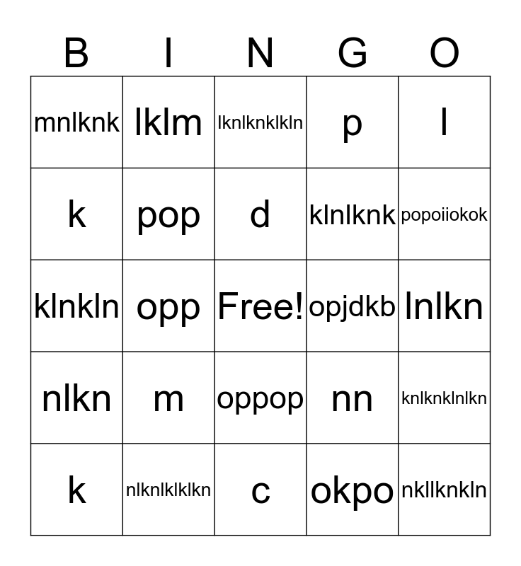 This bingo card has a free space and 25 words: m, c, d, k, l, mnlknk, k, lklm, opjdkb, oppop, klnlknk, klnkln, nn, knlknklnlkn, pop, nklnlnklnkipo, lnlkn, lknlknklkln, popoiiokok, opp, nkllknkln, nlknlklklkn, nlkn, p and okpo.