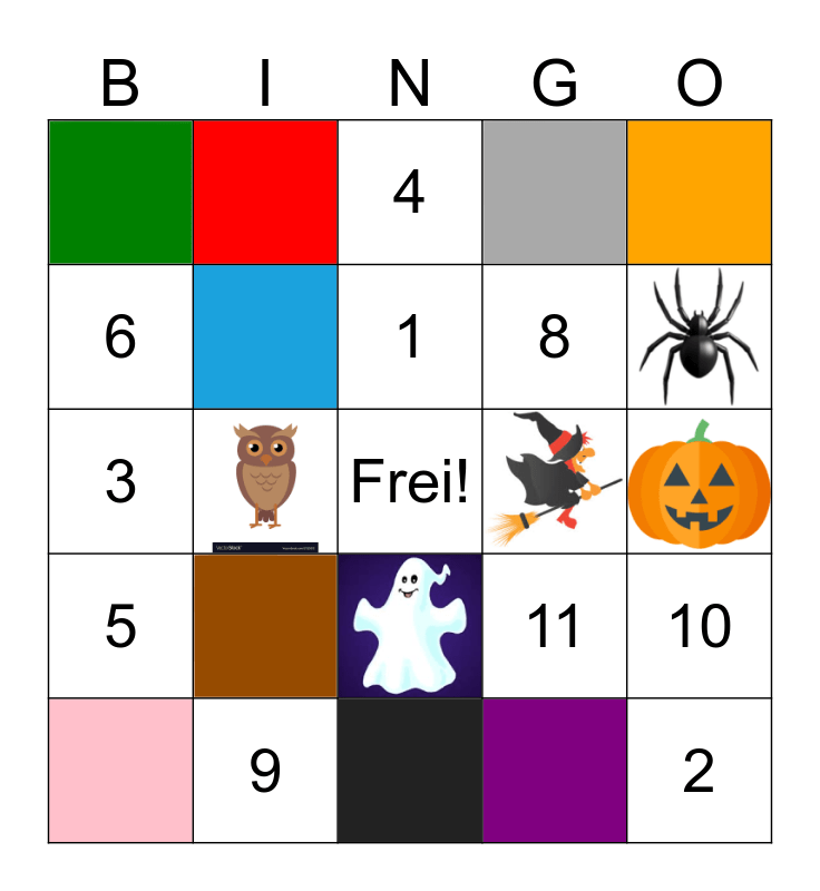 This bingo card has 17 images, a free space and 11 words: 10, 8, 6, 4, 5, 3, 9, 7, 1, 2 and 11.
