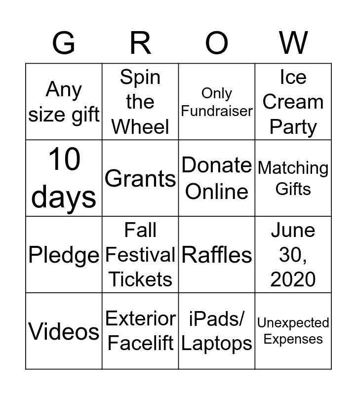 This bingo card has 24 words: Elevator, 100% Participation, Matching Gifts, Pizza Delivery, 10 days, Any size gift, Grants, Spin the Wheel, Exterior Facelift, Dress Down Day, Pledge, Raffles, Contagious Giving, Pom Poms, Donate Online, Payroll Deduction, iPads/ Laptops, Only Fundraiser, Fall Festival Tickets, June 30, 2020, Videos, Unexpected Expenses, Ice Cream Party and Homeroom.