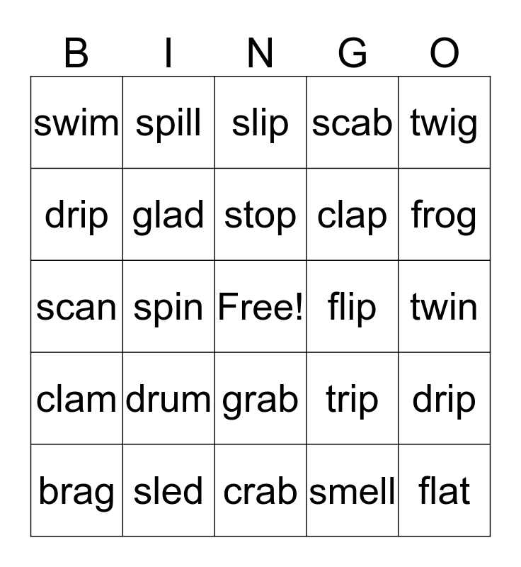 This bingo card has a free space and 29 words: brag, squid, spin, plus, swim, slip, glad, drum, flip, sled, twin, flat, crab, smell, frog, skill, grab, clam, twig, scan, trip, spin, clap, drip, scab, spill, drip, stop and squid.
