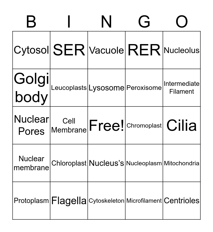 This bingo card has a free space and 29 words: Protoplasm, Cytoplasm, Cell Membrane, Cell Wall, Cytosol, Vacuole, Leucoplasts, Chloroplast, Chromoplast, Flagella, Cilia, Centrioles, Cytoskeleton, Microfilament, Intermediate Filament, Microtubule, Nucleus’s, Nuclear membrane, Nucleolus, Nuclear Pores, Nucleoplasm, Chromatin, Peroxisome, Golgi body, RER, SER, Mitochondria, Lysosome and Ribosomes.