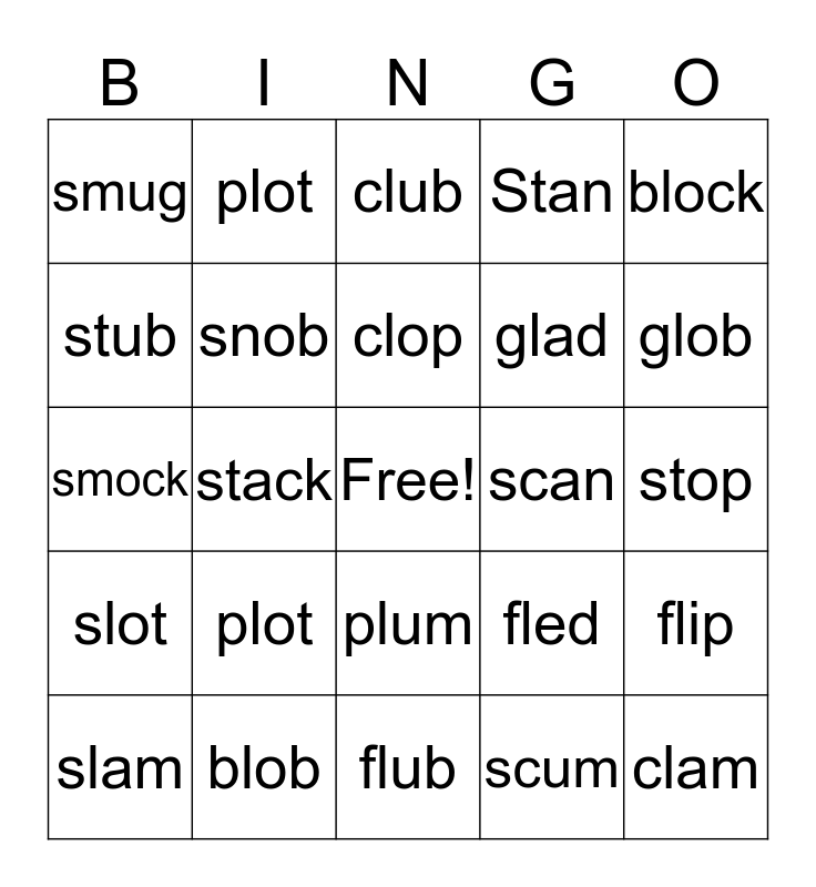 This bingo card has a free space and 29 words: slam, glass, stack, flag, smug, club, snob, plot, scan, blob, stop, clam, flub, scum, glob, skill, plum, slot, block, smock, fled, snug, glad, stub, Stan, plot, flip, clop and snip.
