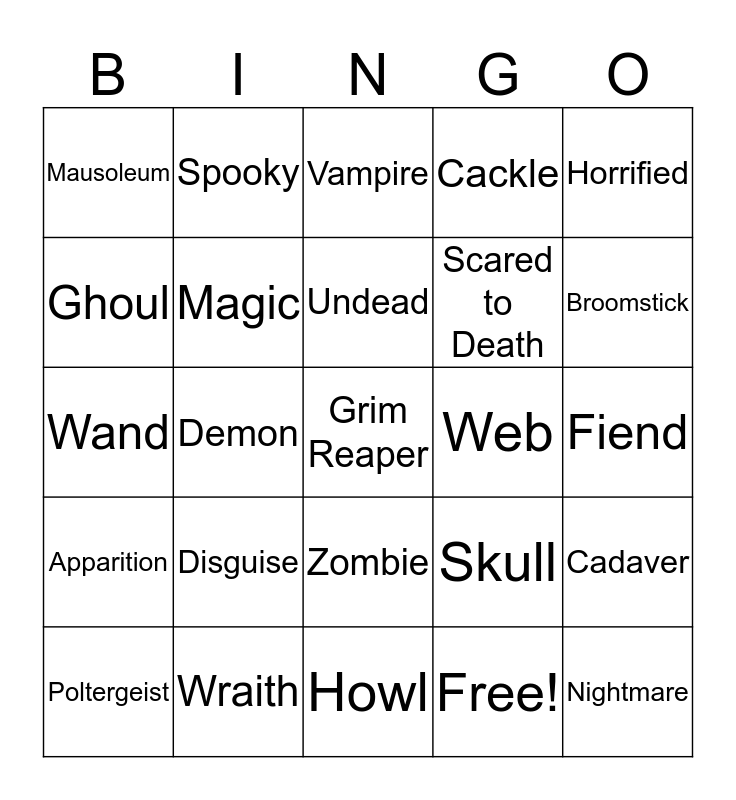 This bingo card has 30 words: Wraith, Casket, Demon, Shock, Mausoleum, Vampire, Magic, Zombie, Web, Howl, Fiend, Grim Reaper, Free!, Nightmare, Broomstick, Eerie, Skull, Apparition, Disguise, Horrified, Wand, Fangs, Spooky, Scared to Death, Ghoul, Cackle, Cadaver, Poltergeist, Undead and Skeleton.