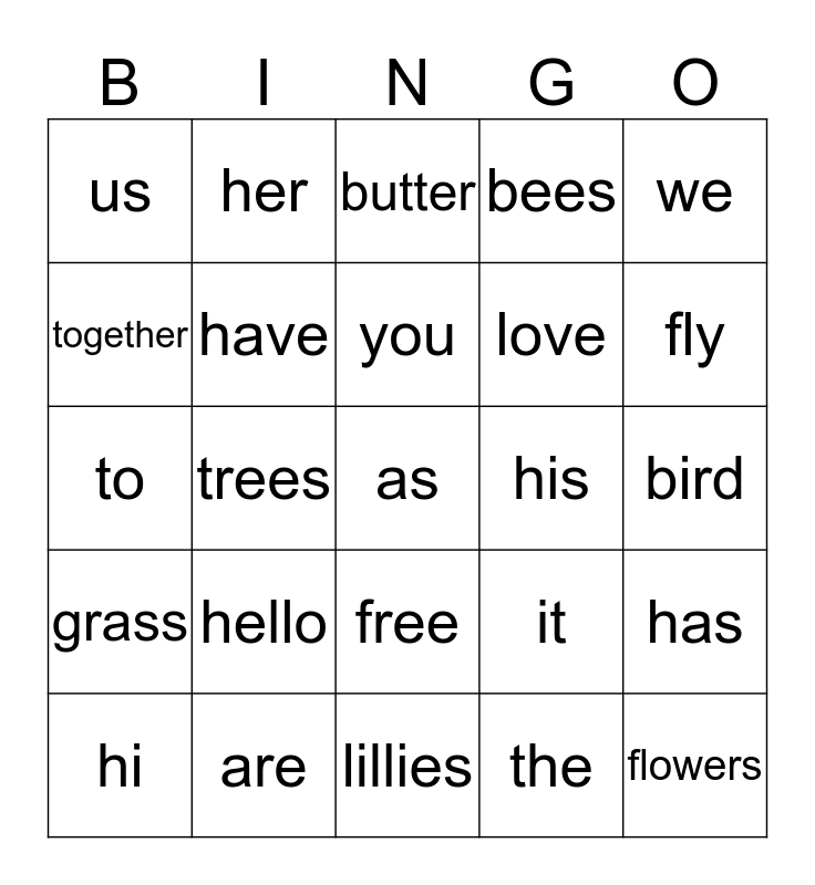 This bingo card has a free space and 24 words: hello, are, you, hi, we, us, together, her, his, free, love, to, it, has, have, the, bird, butter, fly, trees, flowers, grass, bees and lillies.