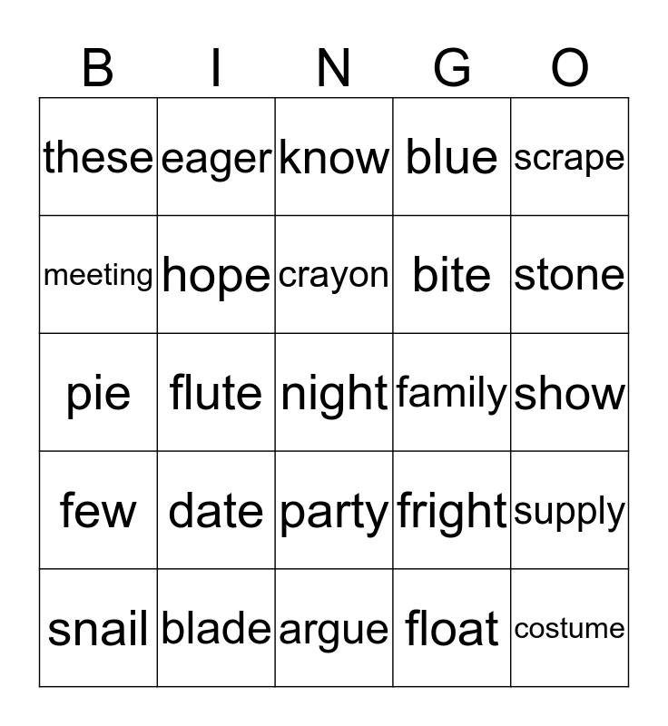 This bingo card has a free space and 24 words: date, blade, crayon, snail, scrape, these, meeting, eager, family, party, bite, pie, fright, supply, hope, float, show, know, stone, flute, costume, few, blue and argue.