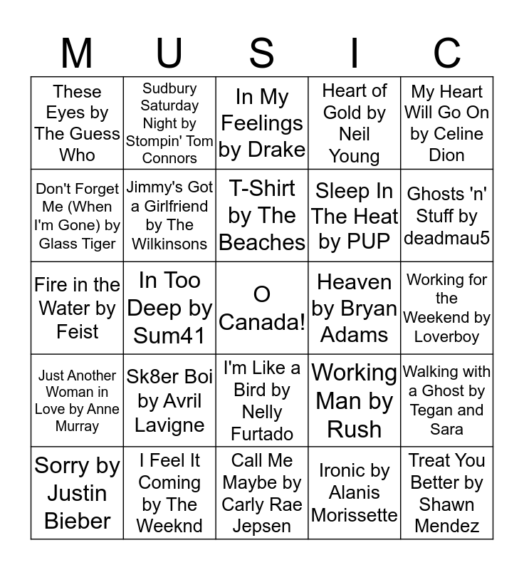 This bingo card has a free space and 45 words: Rockstar by Nickelback, Treat You Better by Shawn Mendez, Get Higher by Palaye Royale, Sorry by Justin Bieber, Here by Alessia Cara, Ironic by Alanis Morissette, In My Feelings by Drake, Man! I Feel Like a Woman! by Shania Twain, My Heart Will Go On by Celine Dion, I Feel It Coming by The Weeknd, Heart of Gold by Neil Young, Heaven by Bryan Adams, I'm Like a Bird by Nelly Furtado, Sk8er Boi by Avril Lavigne, Haven't Met You Yet by Michael Buble, Call Me Maybe by Carly Rae Jepsen, Put Your Head on My Shoulder by Paul Anka, Fire in the Water by Feist, Dangerous by Kardinal Offishall, Ghosts 'n' Stuff by deadmau5, Sudbury Saturday Night by Stompin' Tom Connors, Welcome to My Life by Simple Plan, Pinch Me by Barenaked Ladies, These Eyes by The Guess Who, Try Honesty by Billy Talent, Working for the Weekend by Loverboy, Animal I Have Become by Three Days Grace, Hallelujah by k.d. lang, Working Man by Rush, Just Another Woman in Love by Anne Murray, Waste My Time by Johnny Orlando, Walking with a Ghost by Tegan and Sara, Edge by Rezz, The Ring Goes South by Howard Shore, Sandcastles in the Sand by Robin Sparkles, In Too Deep by Sum41, Baby, I'm For Real by Bobby Taylor & The Vancouvers, Wake Up by Arcade Fire, I'm An Adult Now by Pursuit of Happiness, T-Shirt by The Beaches, Don't Forget Me (When I'm Gone) by Glass Tiger, Sleep In The Heat by PUP, Seventeen by Peach Pit, Jimmy's Got a Girlfriend by The Wilkinsons and We Don't Know by The Strumbellas.