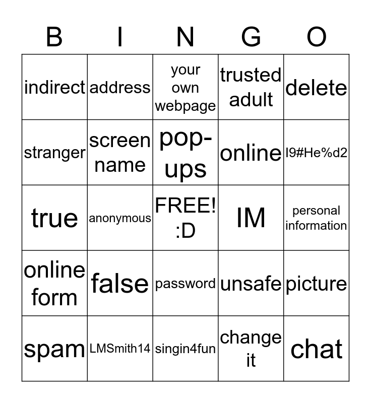 This bingo card has a free space and 24 words: false, LMSmith14, pop-ups, spam, delete, indirect, stranger, address, IM, password, online, true, unsafe, picture, screen name, change it, personal information, your own webpage, I9#He%d2, anonymous, chat, online form, trusted adult and singin4fun.