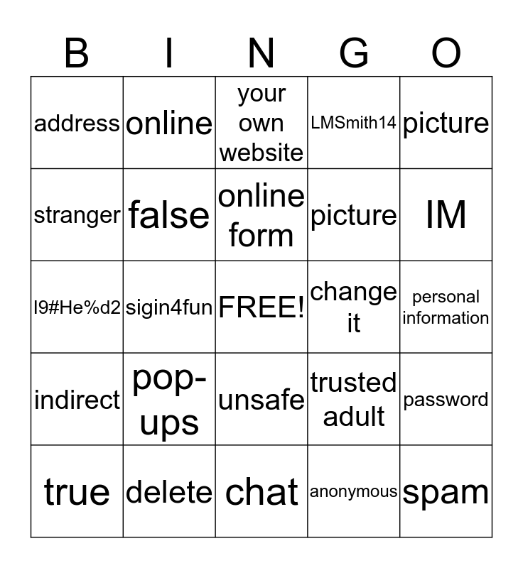 This bingo card has a free space and 24 words: pop-ups, delete, online form, true, picture, address, stranger, online, change it, unsafe, picture, I9#He%d2, trusted adult, password, false, anonymous, personal information, your own website, IM, sigin4fun, spam, indirect, LMSmith14 and chat.
