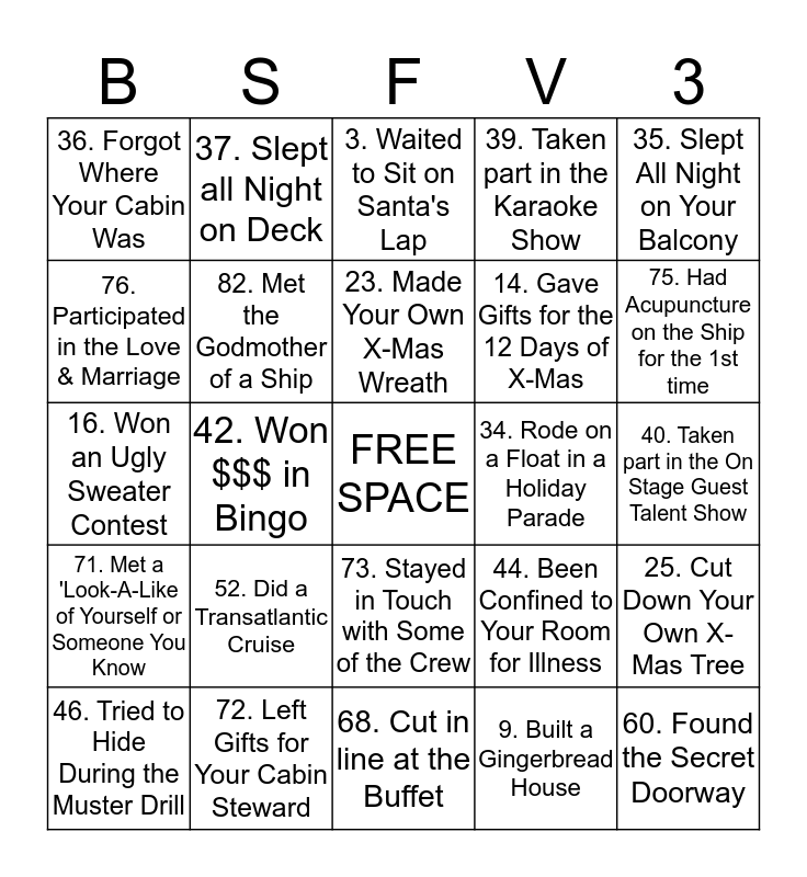 This bingo card has a free space and 90 words: 1. Ate Santa's Cookies/Milk, 2. Kissed Under the Mistletoe, 3. Waited to Sit on Santa's Lap, 4. Given or Received a Fruitcake, 5. Gone Holiday Caroling, 6. Been to a Tree Lighting Ceremony, 7. Read 'Tis the Night Before...', 8. Tried to Surprise Santa in the Act, 9. Built a Gingerbread House, 10. Built a Snowman, 11. Celebrated X-Mas on a Carnival Cruise, 12. Took Part in a Cookie Exchange, 13. Finished X-Mas Shopping on Black Friday, 14. Gave Gifts for the 12 Days of X-Mas, 15. Gone Skiing for the Holidays, 16. Won an Ugly Sweater Contest, 17. Won a Hairy Chest Contest, 18. Made Homemade X-Mas Gifts, 19. Been to See the Rockette's Perform, 20. Been the A Nutcracker Live Performance, 21. Been on a Cruise over the Holidays, 22. Been to Rockefeller Center, 23. Made Your Own X-Mas Wreath, 24. Hosted a Holiday Party, 25. Cut Down Your Own X-Mas Tree, 26. Celebrated X-Mas with an Artificial Tree, 27. Received or Given a Bag of Coal, 28. Looked at Holiday Lights on X-Mas Eve, 29. Re'Gifted' a Gift, 30. Sent a Letter to the North Pole, 31. Worked at a Soup Kitchen Over the Holiday, 32. Made Popcorn Strings for Your Tree, 33. Made Paper Snowflakes for Windows, 34. Rode on a Float in a Holiday Parade, 35. Slept All Night on Your Balcony, 36. Forgot Where Your Cabin Was, 37. Slept all Night on Deck, 38. Found the Ship's Hidden Coin, 39. Taken part in the Karaoke Show, 40. Taken part in the On Stage Guest Talent Show, 41. Won $$$ in the Casino, 42. Won $$$ in Bingo, 43. Won a Free Cruise, 44. Been Confined to Your Room for Illness, 45. Been Sent to the Naughty Room, 46. Tried to Hide During the Muster Drill, 47. Bought the FTTF Pass, 48. Took Part in the Hairy Chest Contest, 49. Took a Journey Cruise, 50. Cruised Overseas, 51. Cruised Thru the Panama Canal, 52. Did a Transatlantic Cruise, 53. Flew Outside the US to Catch a Ship, 54. Live Outside the US, 55. Missed Your Ship, 56. Been a 'Dock Runner', 57. Been to the Infirmary, 58. Been Quarantined to Your Cabin, 59. Ate with the Captain or His Officers, 60. Found the Secret Doorway, 61. Done the Titanic Pose, 62. Attended an Art Auction, 63. Bought a Piece of Art, 64. Participated on Stage During a Game, 65. Danced in the St Jude Party on Deck, 66. Did a Build-A-Bear on a Cruise, 67. Been a 'Chair Hog', 68. Cut in line at the Buffet, 69. Cruised with People You Met on Other Cruises, 70. Made Long-Lasting Friendships Onboard, 71. Met a 'Look-A-Like of Yourself or Someone You Know, 72. Left Gifts for Your Cabin Steward, 73. Stayed in Touch with Some of the Crew, 74. Been Down the Carnival Slides, 75. Had Acupuncture on the Ship for the 1st time, 76. Participated in the Love & Marriage, 77. Remember the Midnight Buffet, 78. Been Told to 'Ride Out the Storm' in Your Room, 79. Taken a Bridge Tour, 80. Bought Jewelry in Port and Later Found Out It Was Fake, 81. Took Part in a Hypnotist' Show, 82. Met the Godmother of a Ship, 83. Are Life-Long friends with Your CD, 84. Would Live on a Cruise Ship, 85. If This is Your 1st Cruise, 86. If This is Your 1st Cruise as a Platinum Member, 87. If This is Your 1st Cruise as a Diamond Member, 88. Have Been or Are in the Military, 89. Are in a Service Field and 90. Booked a Suite.