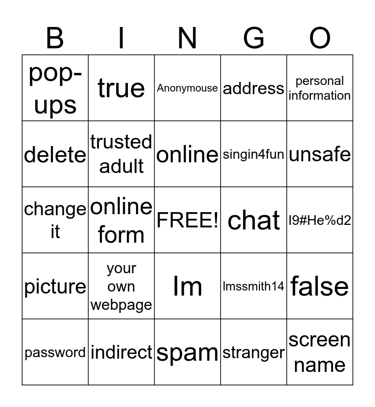 This bingo card has a free space and 24 words: your own webpage, indirect, online, password, personal information, pop-ups, delete, true, chat, Im, singin4fun, change it, lmssmith14, false, trusted adult, stranger, I9#He%d2, Anonymouse, unsafe, online form, screen name, picture, address and spam.