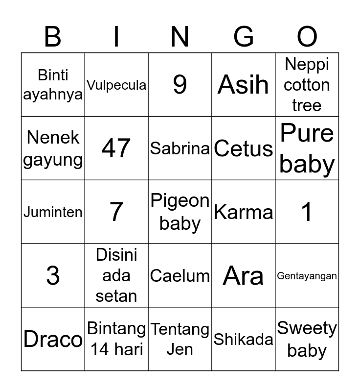 This bingo card has 25 words: Disini ada setan, Tentang Jen, Sabrina, Draco, Neppi cotton tree, Binti ayahnya, Nenek gayung, Vulpecula, Karma, Caelum, Cetus, Juminten, Ara, Gentayangan, 47, Sweety baby, 1, 9, Pure baby, 7, Pigeon baby, Bintang 14 hari, 3, Asih and Shikada.