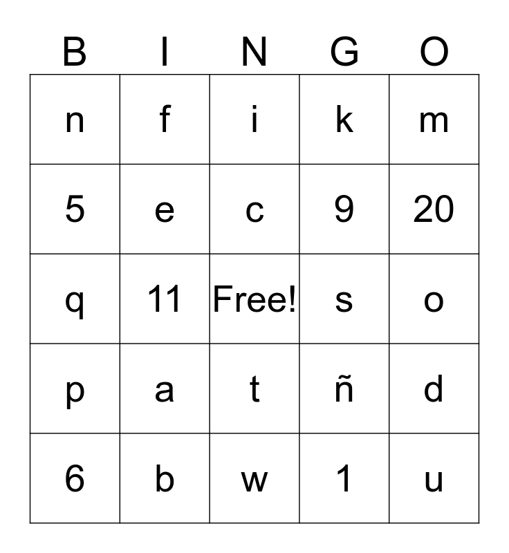 This bingo card has a free space and 24 words: a, b, c, 6, m, n, 5, f, s, t, 9, q, ñ, d, e, 1, o, i, 20, 11, u, p, k and w.