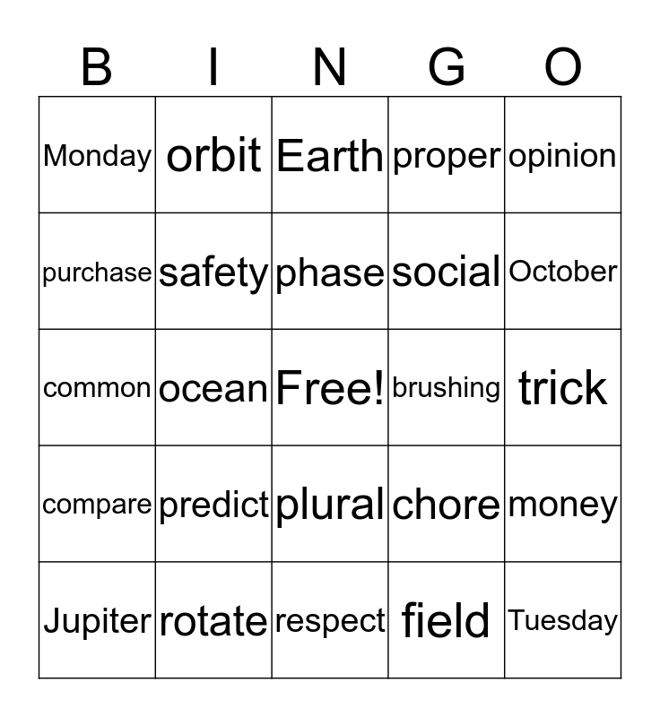 This bingo card has a free space and 28 words: money, treat, social, field, purchase, Earth, orbit, compare, brushing, Jupiter, common, proper, rotate, respect, October, island, predict, safety, phase, plural, Monday, border, Tuesday, ocean, trick, chore, opinion and rounding.
