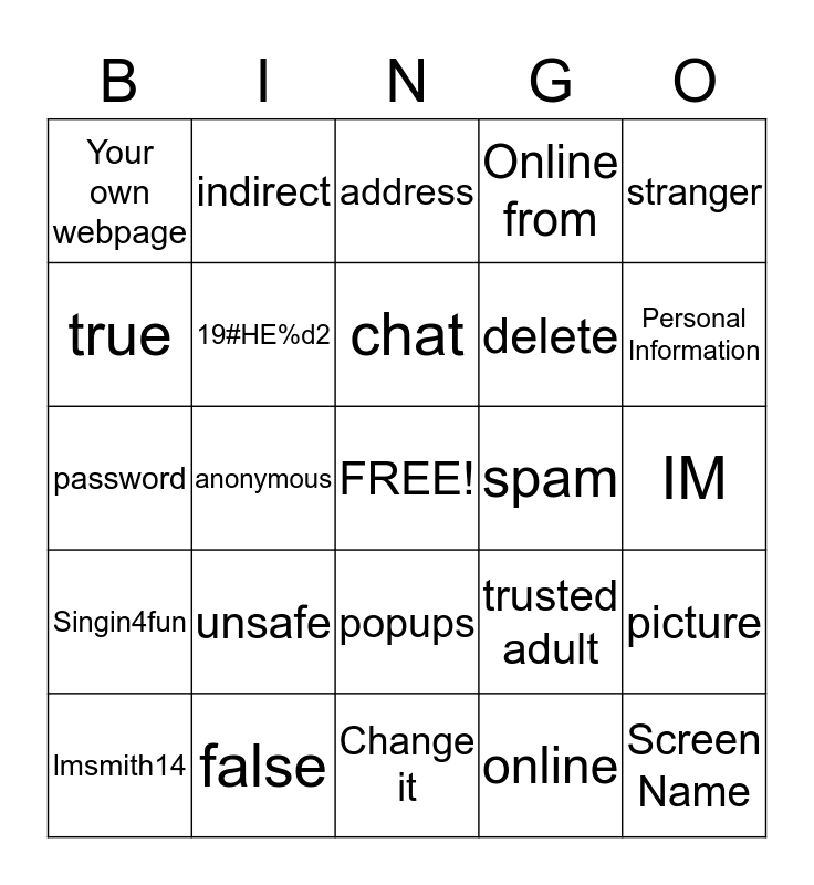 This bingo card has a free space and 24 words: unsafe, false, chat, lmsmith14, stranger, Your own webpage, true, indirect, spam, popups, delete, password, trusted adult, picture, 19#HE%d2, online, IM, address, Personal Information, anonymous, Screen Name, Singin4fun, Online from and Change it.