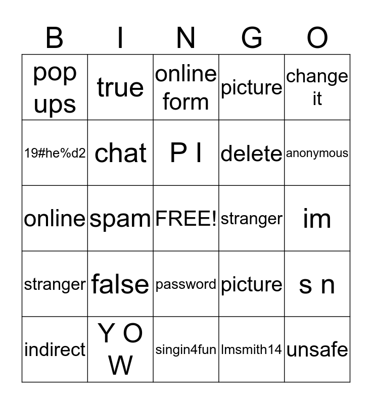 This bingo card has a free space and 24 words: false, Y O W, P I, indirect, change it, pop ups, 19#he%d2, true, stranger, password, delete, online, picture, s n, chat, lmsmith14, im, online form, anonymous, spam, unsafe, stranger, picture and singin4fun.