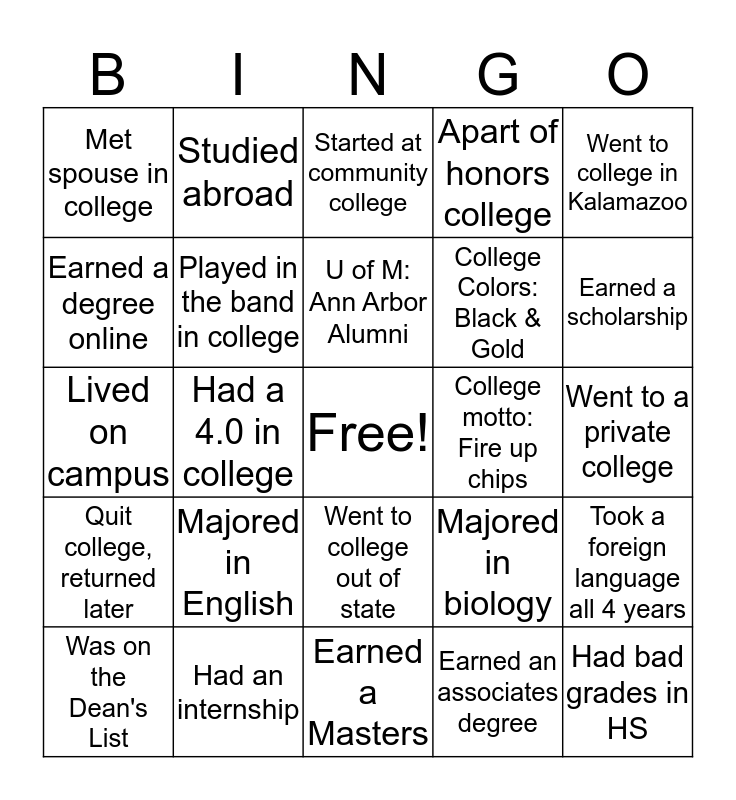 This bingo card has a free space and 29 words: Was on the Dean's List, Child currently in college, Had a 4.0 in college, Played a sport in college, Met spouse in college, Started at community college, Played in the band in college, Majored in English, College motto: Fire up chips, Had an internship, Went to a private college, Had bad grades in HS, Earned a Masters, Earned an associates degree, Earned a scholarship, Was in a club in college, Went to college out of state, Quit college, returned later, Went to college in Kalamazoo, Lived on campus, Majored in biology, College Mascot: Eagle, College Colors: Black & Gold, Earned a degree online, Apart of honors college, Studied abroad, Took a foreign language all 4 years, U of M: Ann Arbor Alumni and Worked full time during college.