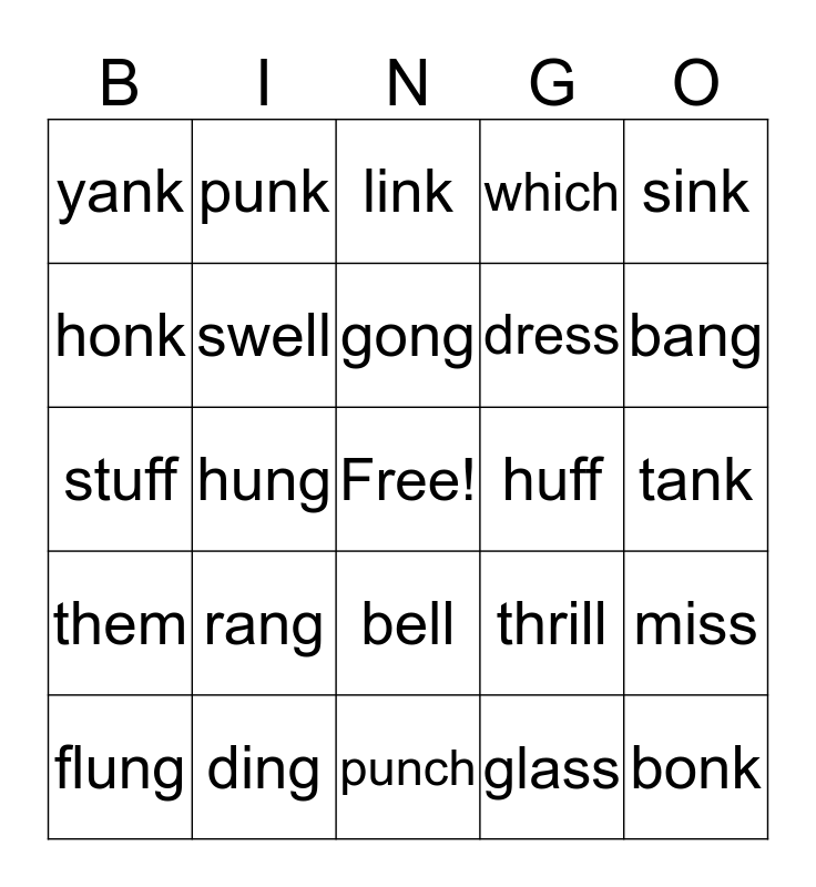 This bingo card has a free space and 24 words: rang, ding, gong, flung, sink, yank, honk, punk, huff, bell, dress, stuff, thrill, miss, swell, glass, tank, link, bang, hung, bonk, them, which and punch.
