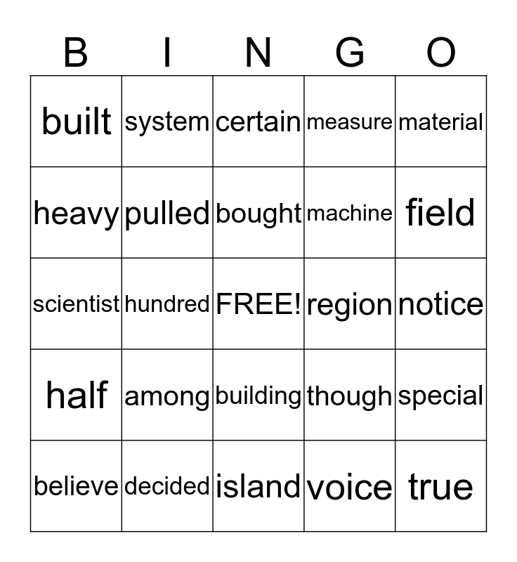 This bingo card has a free space and 24 words: among, decided, bought, believe, material, built, heavy, system, region, building, machine, scientist, though, special, pulled, voice, notice, certain, field, hundred, true, half, measure and island.