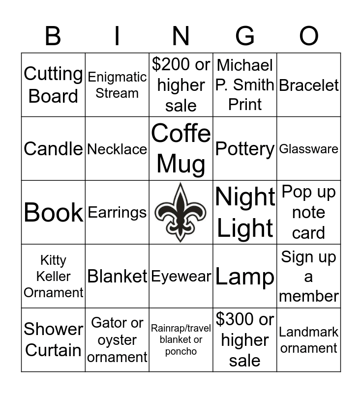 This bingo card has a free space and 29 words: Shower Curtain, Plush toy, Earrings, Tie,belt, or hat, Cutting Board, $200 or higher sale, Necklace, Blanket, Night Light, Gator or oyster ornament, Pop up note card, Landmark ornament, Rainrap/travel blanket or poncho, $300 or higher sale, Glassware, Alexa Pulitzer Stationary, Eyewear, Kitty Keller Ornament, Bracelet, Book, Lamp, Umbrella, Pottery, Candle, Michael P. Smith Print, Enigmatic Stream, Sign up a member, Coffe Mug and Pillow.