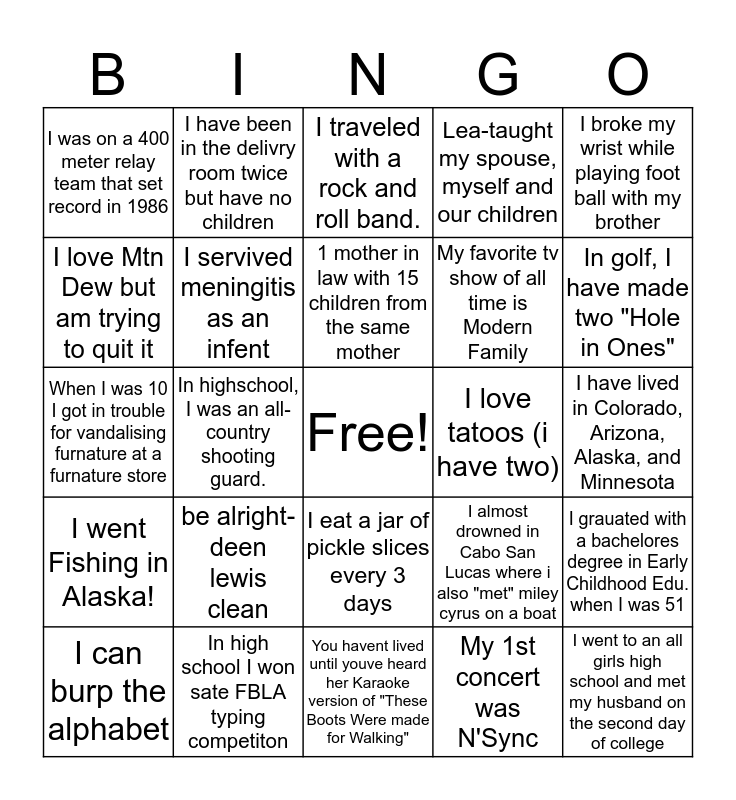 This bingo card has a free space and 24 words: be alright- deen lewis clean, In high school I won sate FBLA typing competiton, 1 mother in law with 15 children from the same mother, I can burp the alphabet, I broke my wrist while playing foot ball with my brother, I was on a 400 meter relay team that set record in 1986, I love Mtn Dew but am trying to quit it, I have been in the delivry room twice but have no children, I love tatoos (i have two), I eat a jar of pickle slices every 3 days, My favorite tv show of all time is Modern Family, When I was 10 I got in trouble for vandalising furnature at a furnature store, I almost drowned in Cabo San Lucas where i also "met" miley cyrus on a boat, I grauated with a bachelores degree in Early Childhood Edu. when I was 51, I servived meningitis as an infent, My 1st concert was N'Sync, I have lived in Colorado, Arizona, Alaska, and Minnesota, I traveled with a rock and roll band., In golf, I have made two "Hole in Ones", In highschool, I was an all-country shooting guard., I went to an all girls high school and met my husband on the second day of college, I went Fishing in Alaska!, Lea-taught my spouse, myself and our children and You havent lived until youve heard her Karaoke version of "These Boots Were made for Walking".