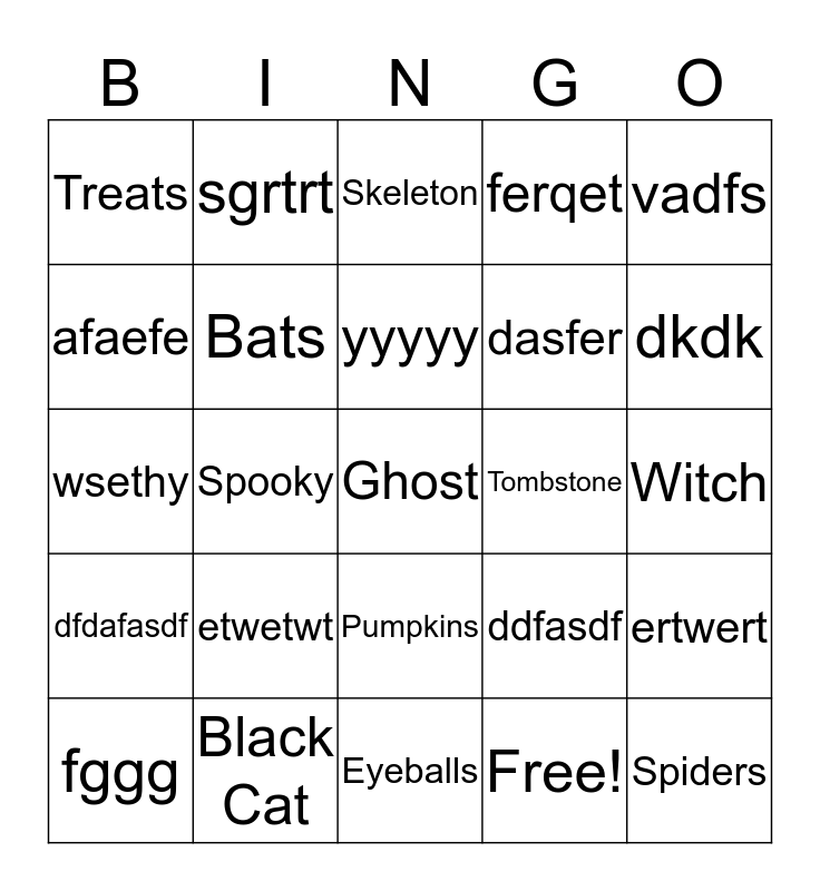 This bingo card has 30 words: Black Cat, Vampire, Spooky, Tricks, Treats, Skeleton, Bats, Pumpkins, Tombstone, Eyeballs, Witch, Ghost, Free!, Spiders, dkdk, dafd, ddfasdf, dfdafasdf, etwetwt, vadfs, wsethy, saete, sgrtrt, dasfer, afaefe, ferqet, ertwert, fggg, yyyyy and dddd.