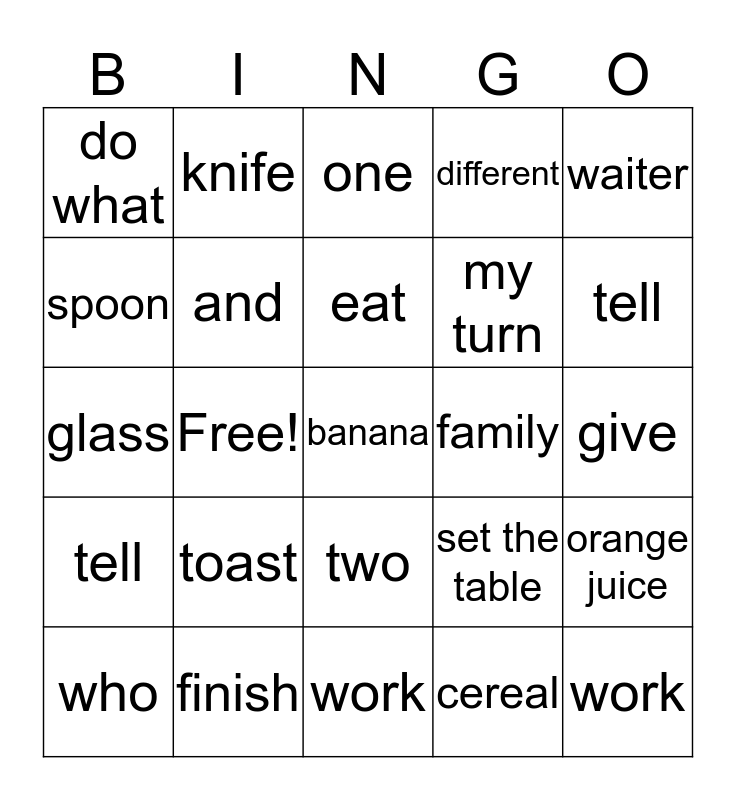 This bingo card has 42 words: cook, eat, egg, toast, cereal, orange juice, banana, milk, one, two, give, tell, Free!, waiter, gone, set the table, plate, glass, fork, knife, spoon, napkin, work, do what, wash, help, my turn, your turn, yesterday, cooking a long time, show, tell, and, work, children, who, finish, family, pity, can't, different and culture.