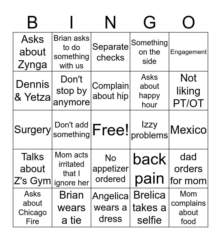 This bingo card has a free space and 24 words: Mom acts irritated that I ignore her, Brian wears a tie, Complain about hip, Asks about Chicago Fire, Engagement, Asks about Zynga, Dennis & Yetza, Brian asks to do something with us, Izzy problems, No appetizer ordered, Asks about happy hour, Surgery, back pain, dad orders for mom, Don't stop by anymore, Brelica takes a selfie, Mexico, Separate checks, Not liking PT/OT, Don't add something, Mom complains about food, Talks about Z's Gym, Something on the side and Angelica wears a dress.