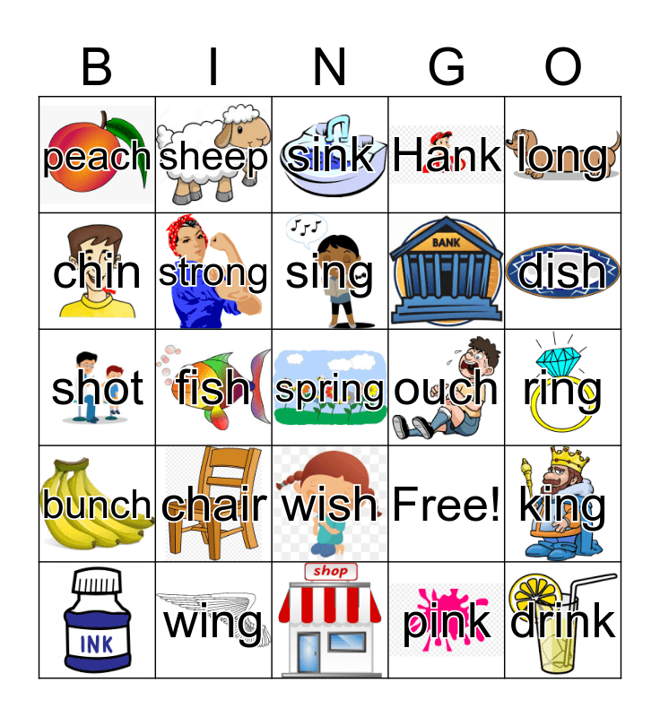 This bingo card has 24 images and 22 words: chair, sing, long, peach, chin, sheep, ouch, wish, shot, Free!, king, strong, drink, ring, sink, dish, fish, spring, wing, bunch, Hank and pink.