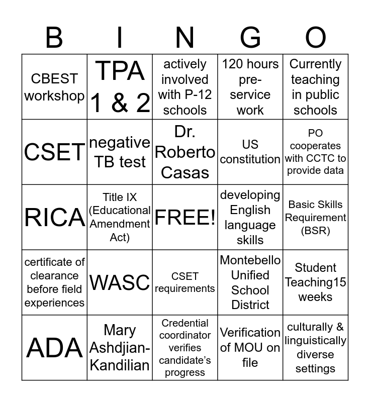 This bingo card has a free space and 24 words: WASC, Mary Ashdjian-Kandilian, Dr. Roberto Casas, ADA, Currently teaching in public schools, CBEST workshop, CSET, TPA 1 & 2, developing English language skills, CSET requirements, US constitution, RICA, Montebello Unified School District, Student Teaching15 weeks, negative TB test, Verification of MOU on file, Basic Skills Requirement (BSR), actively involved with P-12 schools, PO cooperates with CCTC to provide data, Title IX (Educational Amendment Act), culturally & linguistically diverse settings, certificate of clearance before field experiences, 120 hours pre-service work and Credential coordinator verifies candidate’s progress.