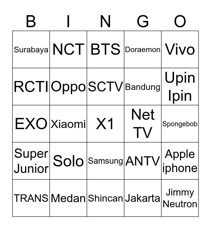 This bingo card has a free space and 24 words: Solo, Medan, SCTV, TRANS, Vivo, Surabaya, RCTI, NCT, Net TV, Samsung, Bandung, EXO, ANTV, Apple iphone, Oppo, Jakarta, Spongebob, BTS, Upin Ipin, Xiaomi, Jimmy Neutron, Super Junior, Doraemon and Shincan.
