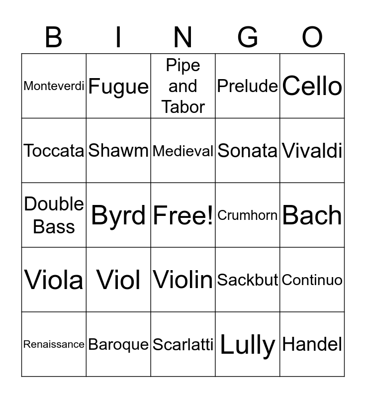 This bingo card has a free space and 29 words: Renaissance, Tallis, Byrd, Palestrina, Monteverdi, Pipe and Tabor, Shawm, Viol, Crumhorn, Baroque, Bach, Handel, Scarlatti, Lully, Vivaldi, Lute, Violin, Viola, Cello, Double Bass, Sackbut, Concerto, Sonata, Toccata, Prelude, Fugue, Continuo, Medieval and Mass.