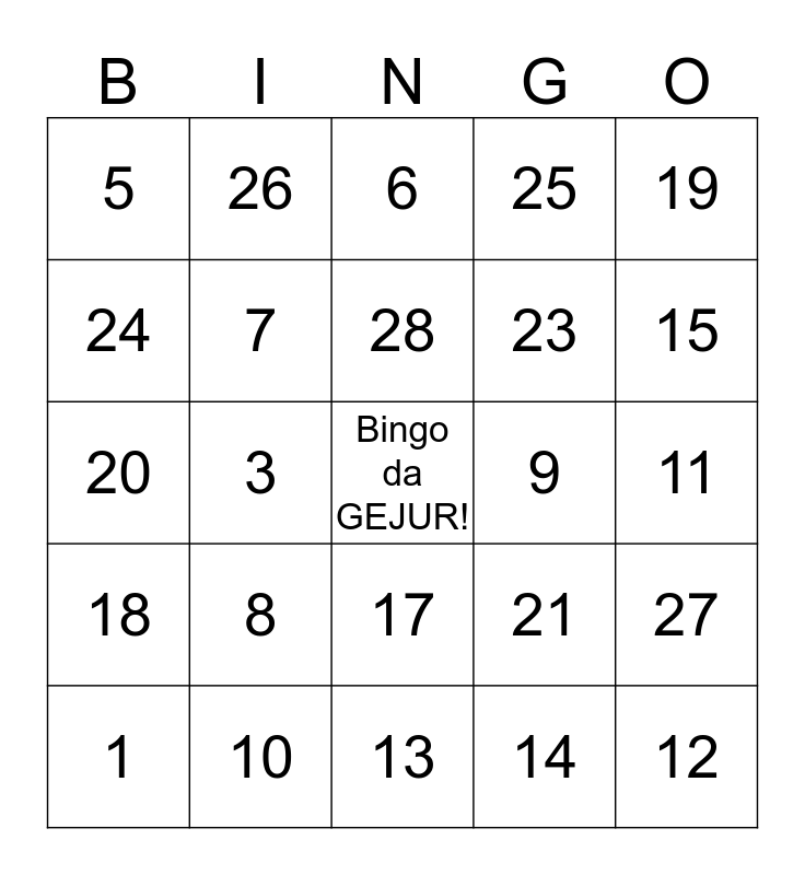 This bingo card has a free space and 29 words: 1, 2, 3, 4, 5, 6, 7, 8, 9, 10, 11, 12, 13, 14, 15, 16, 17, 18, 19, 20, 21, 22, 23, 24, 25, 26, 27, 28 and 29.