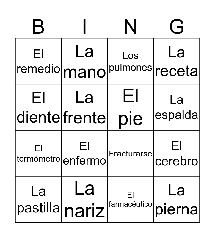 This bingo card has 32 words: Free!, El corazón, El cerebro, El brazo, La pierna, El pie, El diente, El dedo, La mano, El cuello, La espalda, Los pulmones, Las pestañas, El estómago, La nariz, La garganta, Estornudar, Fracturarse, Caerse, Torcerse, La farmacia, El hospital, El farmacéutico, La inyección, La pastilla, La receta, El termómetro, La frente, El remedio, La alergia, El asma and El enfermo.
