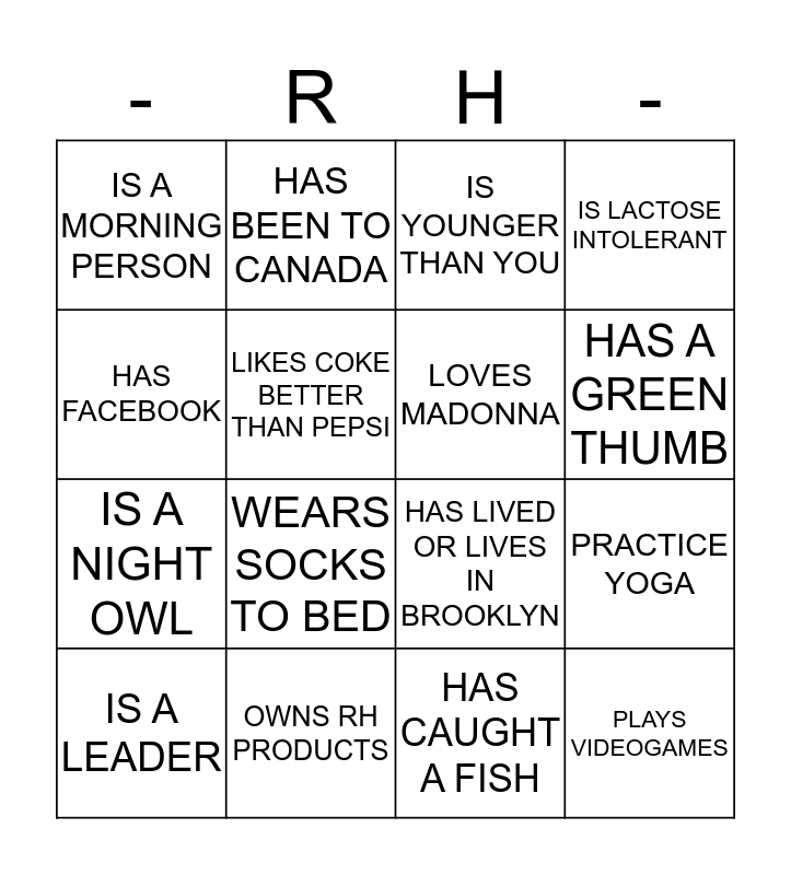 This bingo card has 16 words: OWNS RH PRODUCTS, PRACTICE YOGA, IS YOUNGER THAN YOU, IS A MORNING PERSON, IS A NIGHT OWL, HAS BEEN TO CANADA, HAS LIVED OR LIVES IN BROOKLYN, HAS CAUGHT A FISH, HAS FACEBOOK, LIKES COKE BETTER THAN PEPSI, IS A LEADER, IS LACTOSE INTOLERANT, WEARS SOCKS TO BED, HAS A GREEN THUMB, LOVES MADONNA and PLAYS VIDEOGAMES.