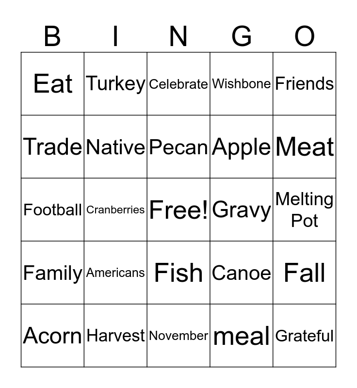 This bingo card has a free space and 29 words: Acorn, Bake, Cranberries, Dinner, Eat, Celebrate, Native, Americans, Gravy, Harvest, Melting Pot, Grateful, November, meal, Meat, Gobble, Fish, Family, Friends, Football, Canoe, Autumn, Apple, Trade, Wishbone, Turkey, Fall, Pecan and Rolls.