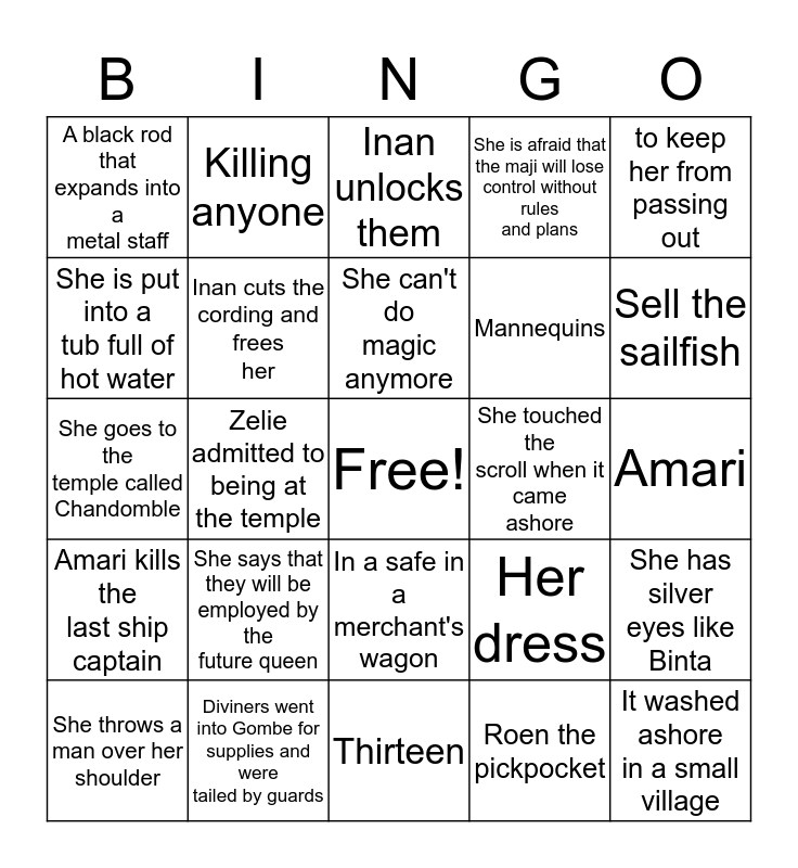 This bingo card has a free space and 29 words: She throws a man over her shoulder, A young boy is being beaten to death, Zelie admitted to being at the temple, She is going to be used as a demonstration that the scroll works, A black rod that expands into a metal staff, Inan unlocks them, Inan cuts the cording and frees her, She says that they will be employed by the future queen, She touched the scroll when it came ashore, Diviners went into Gombe for supplies and were tailed by guards, Amari, It washed ashore in a small village, Thirteen, Roen the pickpocket, Sell the sailfish, Tzain saw Inan and Zelie kiss, In a safe in a merchant's wagon, Amari kills the last ship captain, to keep her from passing out, She goes to the temple called Chandomble, Her dress, The wheel to the door is stuck, Mannequins, She is put into a tub full of hot water, She is afraid that the maji will lose control without rules and plans, Killing anyone, She has silver eyes like Binta, She can't do magic anymore and He is from another land.