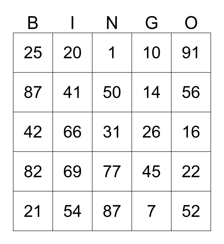 This bingo card has a free space and 24 words: 69, 54, 50, 21, 91, 25, 87, 20, 26, 77, 14, 42, 45, 22, 41, 7, 16, 1, 56, 66, 52, 82, 10 and 87.