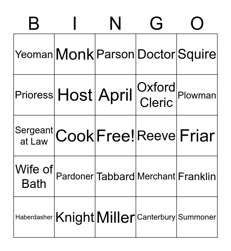 This bingo card has a free space and 26 words: Tabbard, Canterbury, April, Knight, Squire, Yeoman, Prioress, Monk, Friar, Merchant, Oxford Cleric, Sergeant at Law, Franklin, Haberdasher, Cook, Skipper, Doctor, Wife of Bath, Parson, Summoner, Plowman, Miller, Reeve, Pardoner, Host and Manciple.