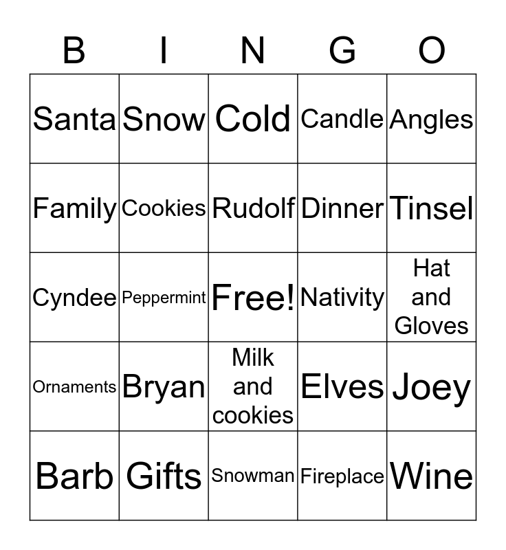 This bingo card has a free space and 50 words: Christmas, Gifts, Sleigh, Fireplace, Joey, Stockings, Snow, Eggnog, Dinner, Christmas Tree, Family, Cookies, Elves, Wine, Betty, Candy Cane, Cold, Nativity, Cheese and Crackers, Santa, Bryan, Snowman, Candle, Tinsel, Ginger bread Man, Star, Rudolf, Christmas Lights, Angles, Ornaments, Mistletoe, David, Matt, Jim, Carol, Karen, Lisa, Wine, Drinks, Cyndee, Train, Nicole, Connor, Jackie, Barb, Peppermint, Milk and cookies, Boots, Hat and Gloves and Scarfs.