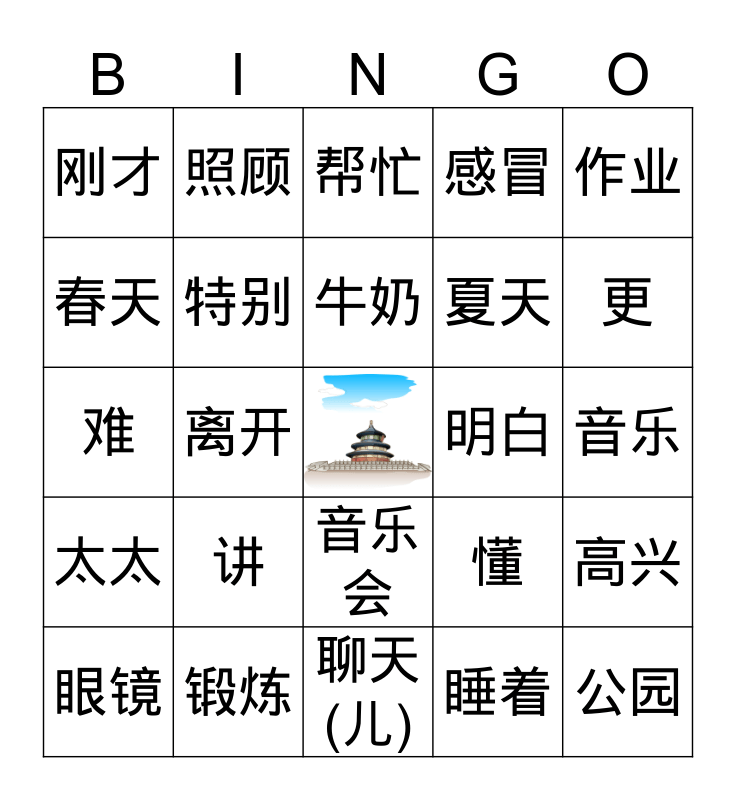 This bingo card has a free space and 29 words: 眼镜, 突然, 离开, 清楚, 刚才, 帮忙, 特别, 讲, 明白, 锻炼, 音乐, 公园, 聊天(儿), 睡着, 更, 讲题, 音乐会, 太太, 作业, 难, 懂, 发烧, 夏天, 春天, 感冒, 照顾, 高兴, 牛奶 and 咖啡.