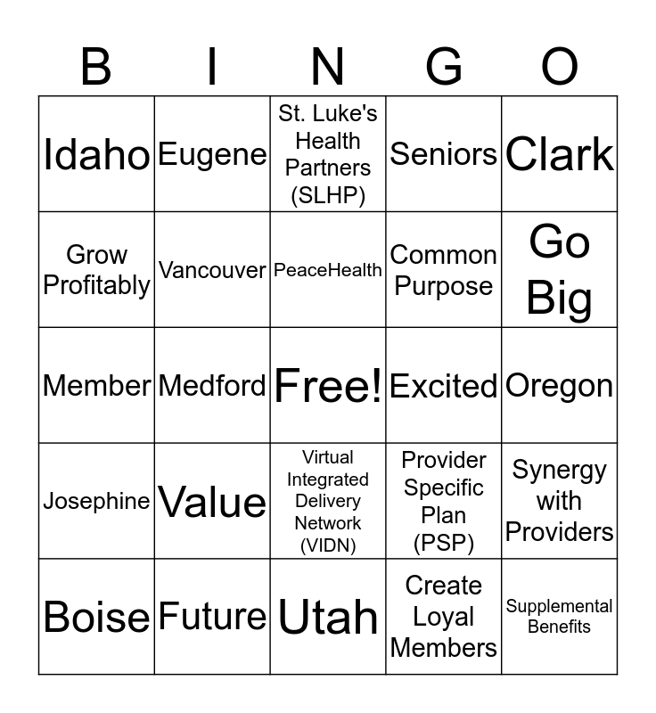 This bingo card has a free space and 33 words: Bellingham, Whatcom, Medford, Jackson, Josephine, Vancouver, Clark, Boise, Eugene, Lane, PeaceHealth, St. Luke's Health Partners (SLHP), Service Area Expansion, New Day, Excited, Go Big, Future, Member, Value, Provider Specific Plan (PSP), Virtual Integrated Delivery Network (VIDN), Washington, Idaho, Oregon, Utah, Supplemental Benefits, Seniors, Common Purpose, Grow Profitably, Synergy with Providers, Achieve 4+ Stars, Create Loyal Members and Moving Forward for Members.