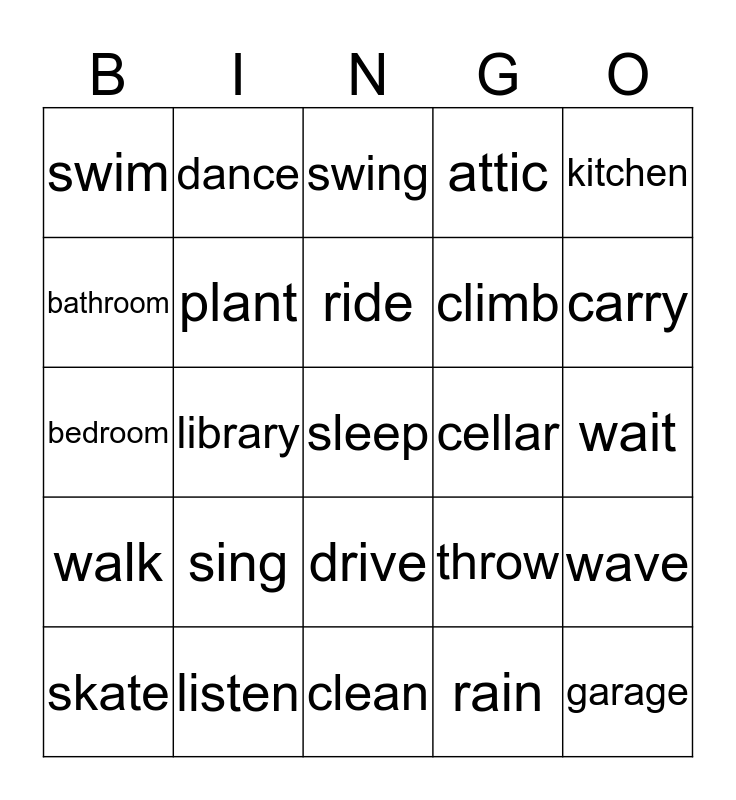 This bingo card has 25 words: sing, clean, ride, skate, kitchen, swim, bathroom, dance, cellar, drive, climb, bedroom, throw, wave, plant, garage, wait, swing, carry, library, sleep, listen, walk, attic and rain.
