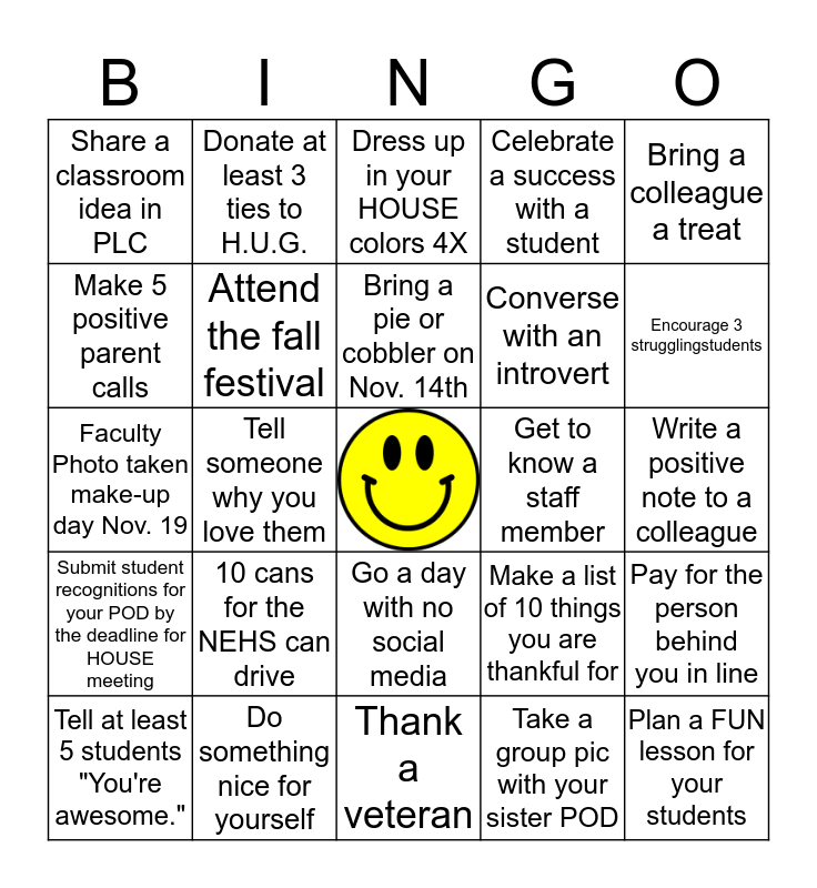 This bingo card has a free space and 24 words: 10 cans for the NEHS can drive, Do something nice for yourself, Bring a pie or cobbler on Nov. 14th, Tell at least 5 students "You're awesome.", Bring a colleague a treat, Share a classroom idea in PLC, Make 5 positive parent calls, Donate at least 3 ties to H.U.G., Get to know a staff member, Go a day with no social media, Converse with an introvert, Faculty Photo taken make-up day Nov. 19, Make a list of 10 things you are thankful for, Pay for the person behind you in line, Attend the fall festival, Take a group pic with your sister POD, Write a positive note to a colleague, Dress up in your HOUSE colors 4X, Encourage 3 strugglingstudents, Tell someone why you love them, Plan a FUN lesson for your students, Submit student recognitions for your POD by the deadline for HOUSE meeting, Celebrate a success with a student and Thank a veteran.